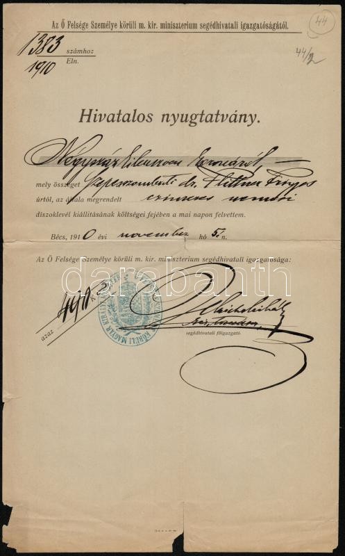 1910 Király személye körüli minisztérium segédhivatali igazgatóságának... https://www.darabanth.com/de/336-Fernauktion/336.0/Kunst-Dokumente-andere-Sammelgebiete/Dokument~500017/1910-Kiraly-szemelye-koruli-miniszterium-segedhivatali-igazgatosaganak-nyugtaja-cimeresle~II1887711