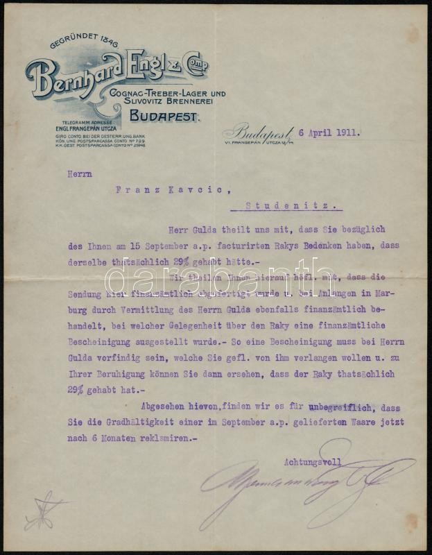1911 Bernhard Engl & Comp. konyak és sörfőzdéje, díszes fejléces l... https://www.darabanth.com/de/336-Fernauktion/336.0/Kunst-Dokumente-andere-Sammelgebiete/Dokument~500017/1911-Bernhard-Engl-Comp-konyak-es-sorfozdeje-diszes-fejleces-level~II1888617