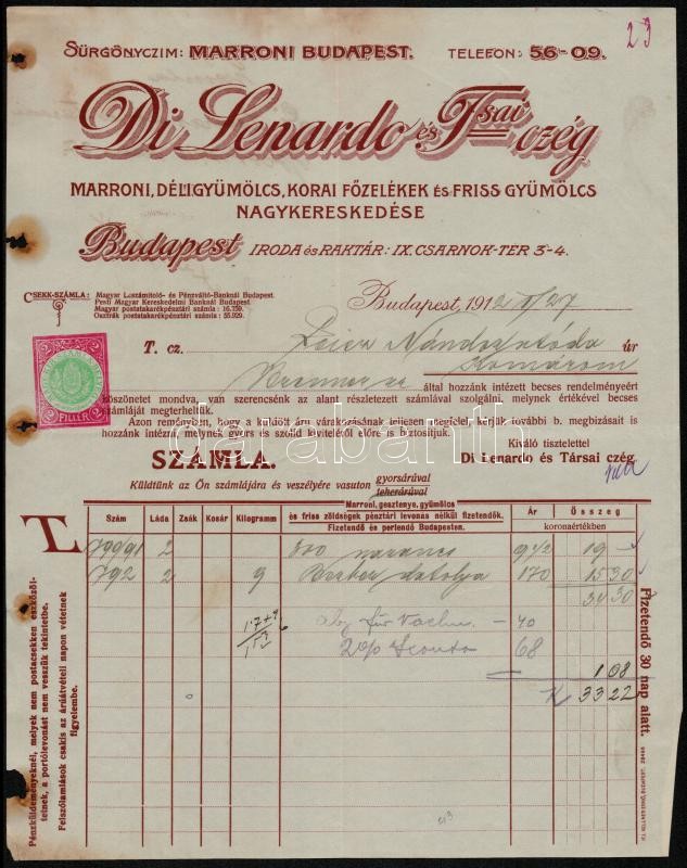 Beschreibung: 1912 Budapest, Di Lenardo és Tsai. marroni, déligyümölcs, korai főzelékek és friss gyümölcs nagykereskedése, díszes fejléces számla, okmánybélyeggel
