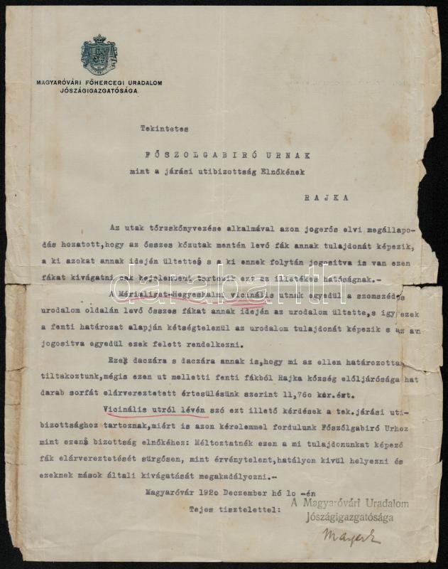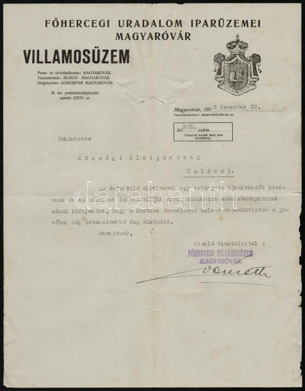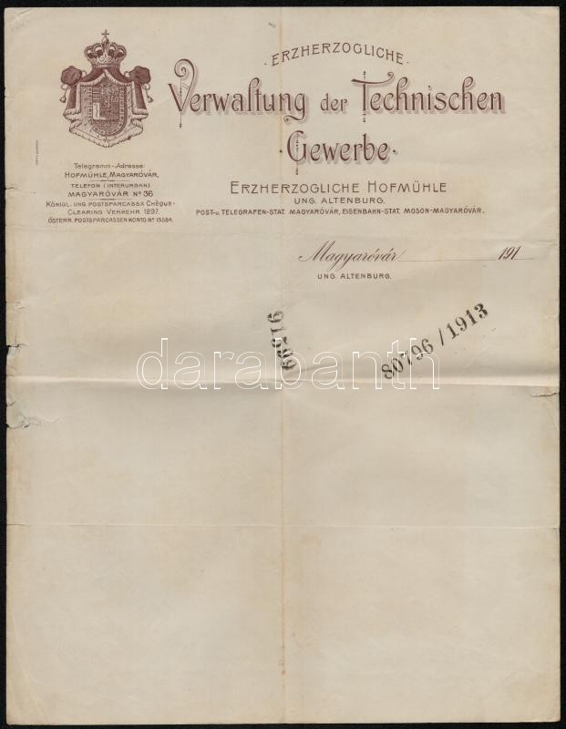 1913-1932 2 db magyaróvári főhercegi uradalmi fejléces levél https://www.darabanth.com/de/336-Fernauktion/336.0/Kunst-Dokumente-andere-Sammelgebiete/Dokument~500017/1913-1932-2-db-magyarovari-fohercegi-uradalmi-fejleces-level~II1887714