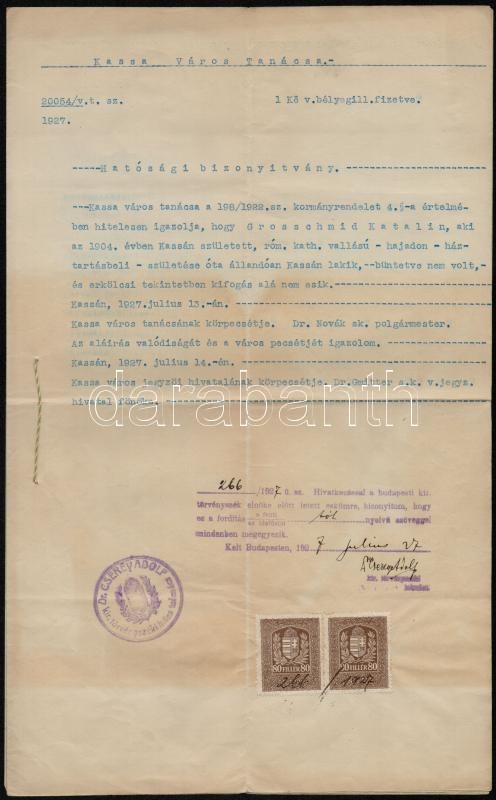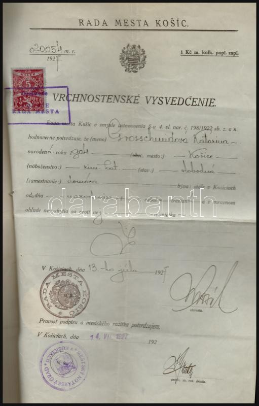 Beschreibung: 1927 Dr. Jáky Gyuláné Grosschmid Kató (1904-1986), Márai Sándor testvérének erkölcsi bizonyítványa. Szlovák nyelven + hiteles magyar fordítás
