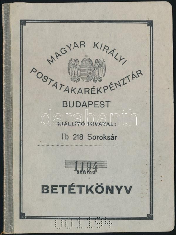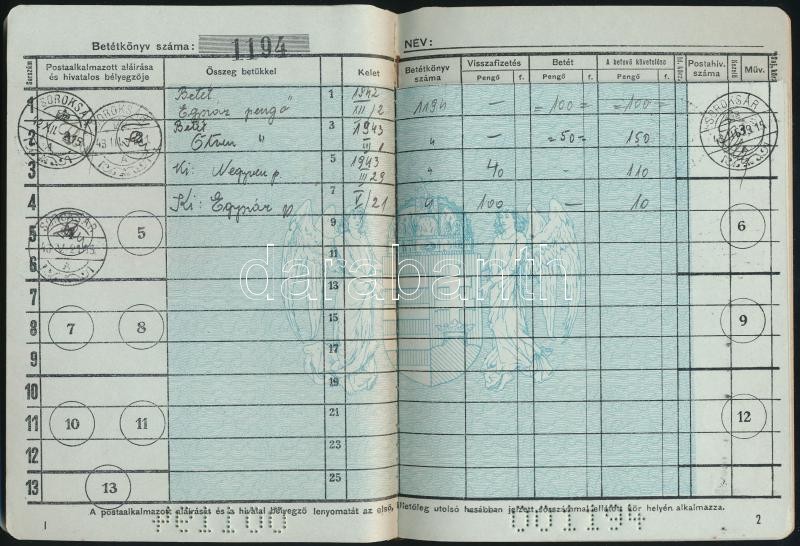 1942-1943 M. Kir. Postatakarékpénztár betétkönyve, két bejegyzéssel. https://www.darabanth.com/de/336-Fernauktion/336.0/Kunst-Dokumente-andere-Sammelgebiete/Dokument~500017/1942-1943-M-Kir-Postatakarekpenztar-betetkonyve-ket-bejegyzessel~II1889182