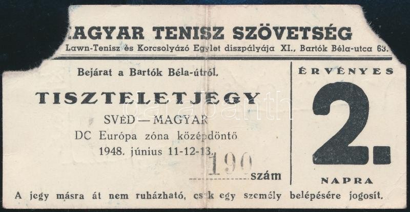 1948 A Magyar Tenisz Szövetség tiszteletjegye a svéd-magyar DC Európa ... https://www.darabanth.com/de/336-Fernauktion/336.0/Kunst-Dokumente-andere-Sammelgebiete/Dokument~500017/1948-A-Magyar-Tenisz-Szovetseg-tiszteletjegye-a-sved-magyar-DC-Europa-zona-kozepdontore-hi~II1886528