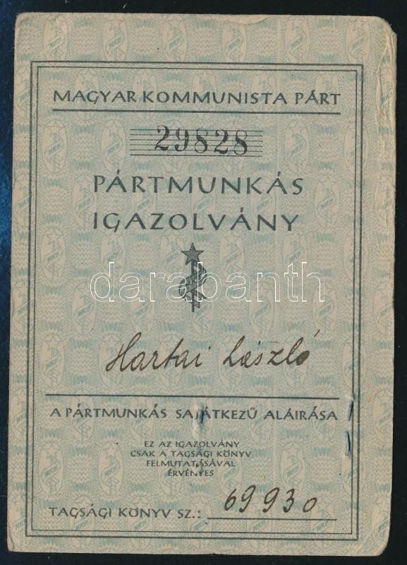 1948 Hartai László (1925-1987) későbbi legfelsőbb bíró fényképes pártm... https://www.darabanth.com/de/336-Fernauktion/336.0/Kunst-Dokumente-andere-Sammelgebiete/Dokument~500017/1948-Hartai-Laszlo-1925-1987-kesobbi-legfelsobb-biro-fenykepes-partmunkatarsi-igazolva~II1887550
