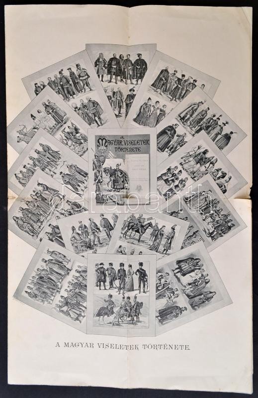 Beschreibung: 1900 Magyar viseletek története c. könyv nagyméretű prospektusa. Bp., Franklin, szakadt, 47x30 cm