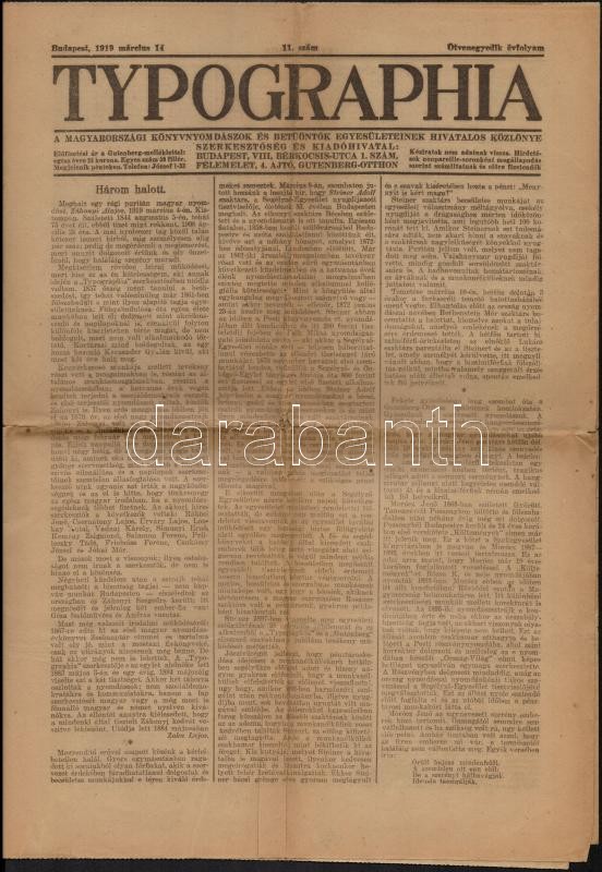 1908-1919 Emlékfüzet Záhonyi Alajos. Ötvenéves nyomdász-jubileumára. Bp.,1908, Pesti Könyvnyomda Rt., 1 t.+46 p. Kiadói papírkötés, az utolsó lap javított. Benne a jubileumi emlékes műsorával.+ 1919 Typographia. 51. évf. 11 sz., 1919. márc. 14., szakadozott, 6 p. Benne Záhonyi Alajosra emlékező cikkel.