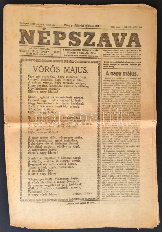 1919 Népszava. A Magyarországi Szocialista Párt reggeli hivatalos lapj... https://www.darabanth.com/de/336-Fernauktion/336.0/Kunst-Dokumente-andere-Sammelgebiete/Drucksachen~500030/1919-Nepszava-A-Magyarorszagi-Szocialista-Part-reggeli-hivatalos-lapja-1919-majus-1-XLVII-C3~II1887218