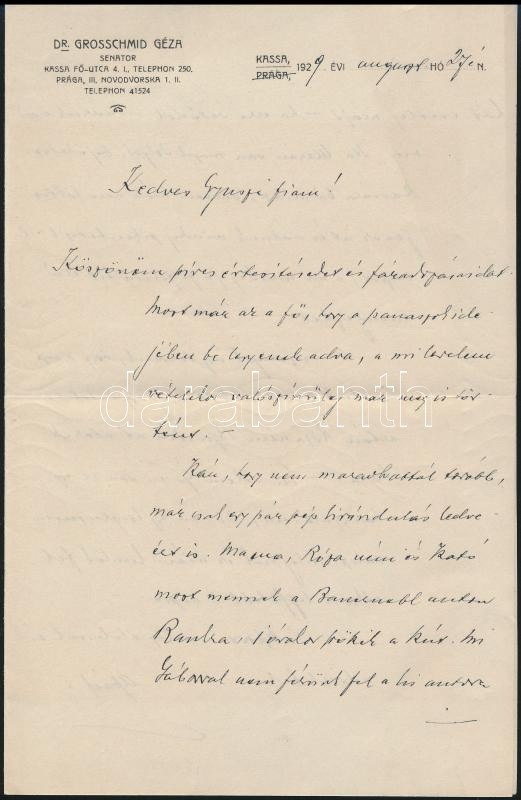 1929 Kassa, Dr. Grosschmid Géza (1872-1934) a kassai jogászkamara elnöke, csehszlovák szenátor, királyi közjegyző, és Márai Sándor apjának saját kezű levele Dr. Jáky/Jetts Gyula, lánya Grosschmid Kató férjének részére, "Kedves Gyuri fiam!" megszólítással, Grosschmid családra vonatkozó tartalommal, fejléces papíron, két teleírt oldal, borítékkal