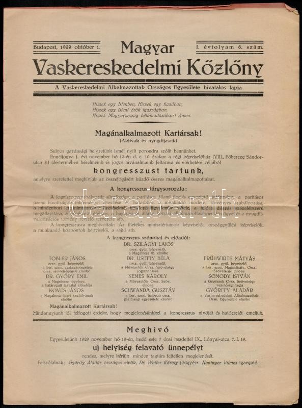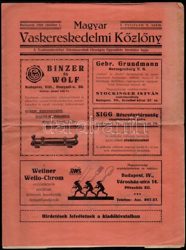 1929 Magyar Vaskereskedelmi Közlöny, I. évf. 6. szám. A Vaskereskedelmi Alkalmazottak Országos Egyesületének hivatalos lapja, korabeli reklámokkal. Bp., Barcza József, 8 p.