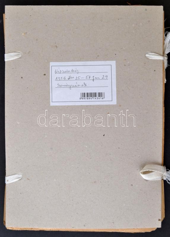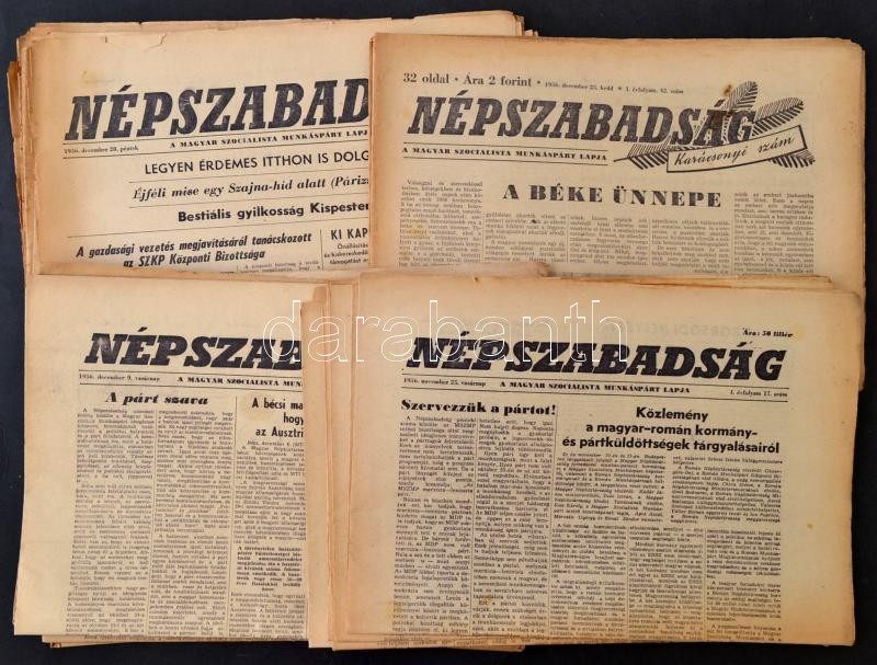 1956-1957 Népszabadság 15 száma, 1956 november 25-december 28., I. évf. 17.-19., 23.-24., 29.,35.-36., 38.-39., 42.-43., 1957. január 11.,27.,79. II. évf. 9., 23.-24., összesen 15 db. Változó állapotban. A Népszabadság 1956. november 2.-án jelent meg elÅ‘ször, az MSZMP hivatalos pártlapjaként. A november-decemberi idÅ‘szak érdekessége, hogy ekkor a lap terjesztése akadozott. Több vidéki postán szabotálták a lap terjesztését. Egyes esetekben a lapok a párt gépkocsijával, fegyveres Å‘rök szállÃtották ki a megyei székhelyekre.