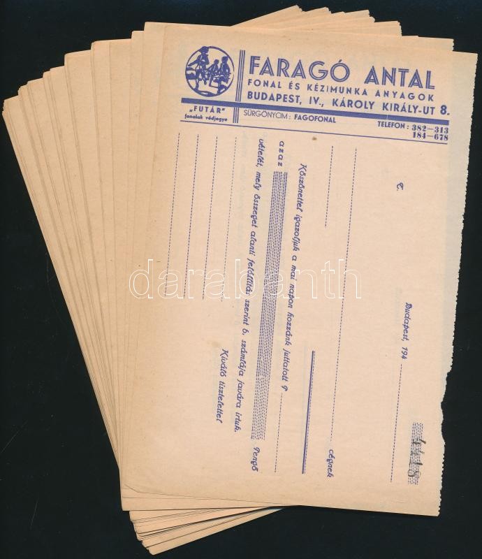 Faragó Antal fonal és kézimunka anyagok fejléces nyomtatványai, kb. 30... https://www.darabanth.com/de/336-Fernauktion/336.0/Kunst-Dokumente-andere-Sammelgebiete/Drucksachen~500030/Farago-Antal-fonal-es-kezimunka-anyagok-fejleces-nyomtatvanyai-kb-30-db~II1884119