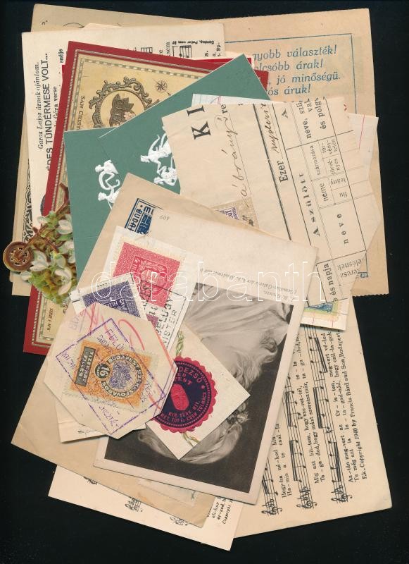 Beschreibung: Vegyes nyomtatvány tétel, kb. 40 db, közte 11 db modern italcímkével, képeslapokkal, bélyegekkel, tábori postával, .stb., változó állapotban.