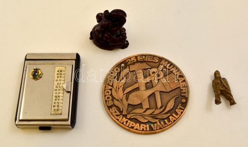 Beschreibung: Kis bolha tétel: műgyanta elefánt szobrocska, lovag játékfigura, fém tokos telefonkönyv, Országos Szakipari Vállalat fém emlékplakett