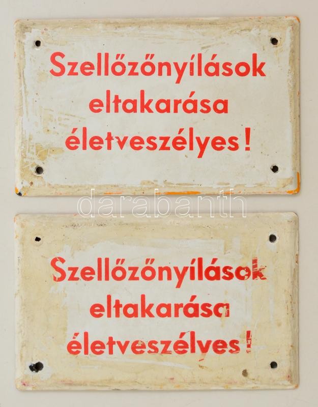 Zománc tábla (2 db): "Szellőzőnyilasok eltakarása életveszélyes!&... https://www.darabanth.com/de/336-Fernauktion/336.0/Kunst-Dokumente-andere-Sammelgebiete/Flohmarkt~500012/Zomanc-tabla-2-db-Szellozonyilasok-eltakarasa-eletveszelyes-felirattal-festekes-10C397~II1889134