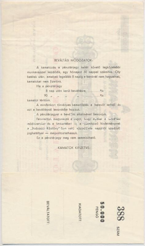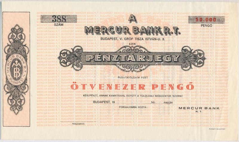 Beschreibung: 1926-1945. "Mercur Bank Rt." bemutatóra szóló, kitöltetlen pénztárjegye 50.000P-ről, vízjeles papíron T:I