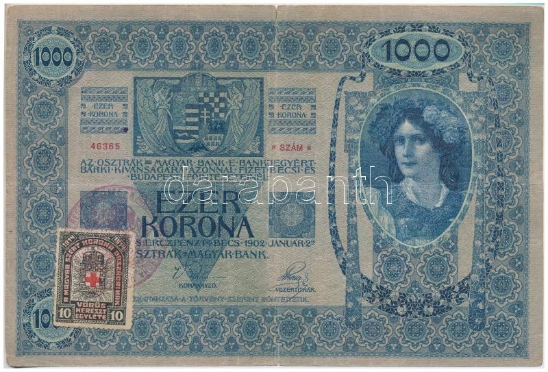 1902. 1000K hamis "A Magyar Szent Korona Országainak Vörös Keresz... https://www.darabanth.com/de/336-Fernauktion/336.0/Numismatik/Ungarische-Banknoten~1500007/1902-1000K-hamis-A-Magyar-Szent-Korona-Orszagainak-Voros-Kereszt-Egylete-belyeggel-es-korbC3~II1887969