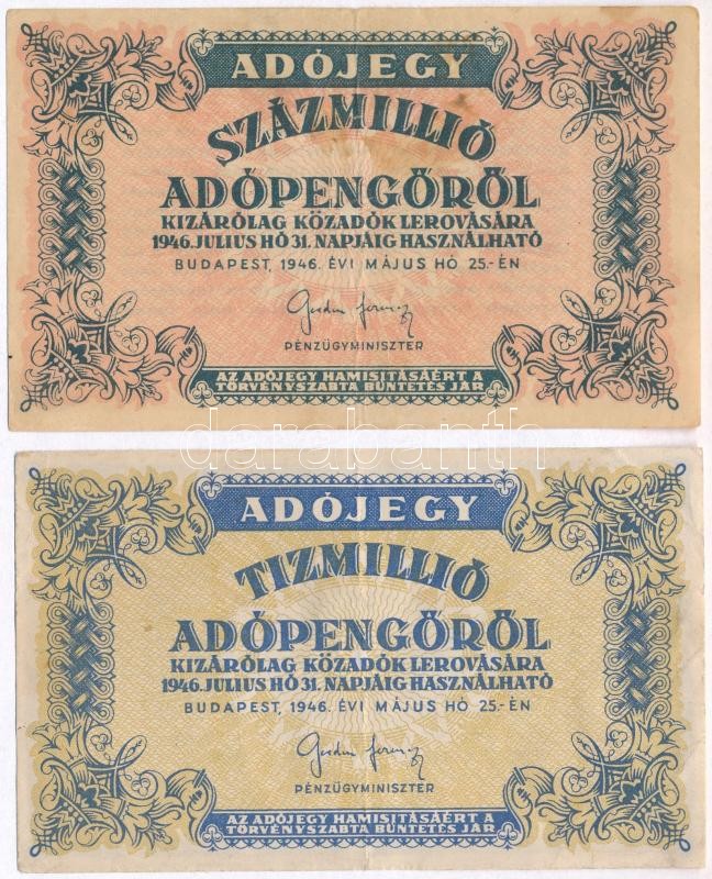 1946. 10.000.000AP + 100.000.000AP T:III fo. https://www.darabanth.com/de/336-Fernauktion/336.0/Numismatik/Ungarische-Banknoten~1500007/1946-10000000AP-plus-100000000AP-TIII-fo~II1887135