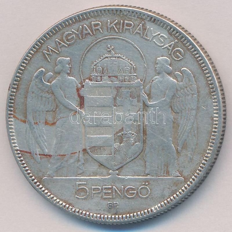 Beschreibung: 1930. 5P Ag "Horthy jobbra" T:3 fo.