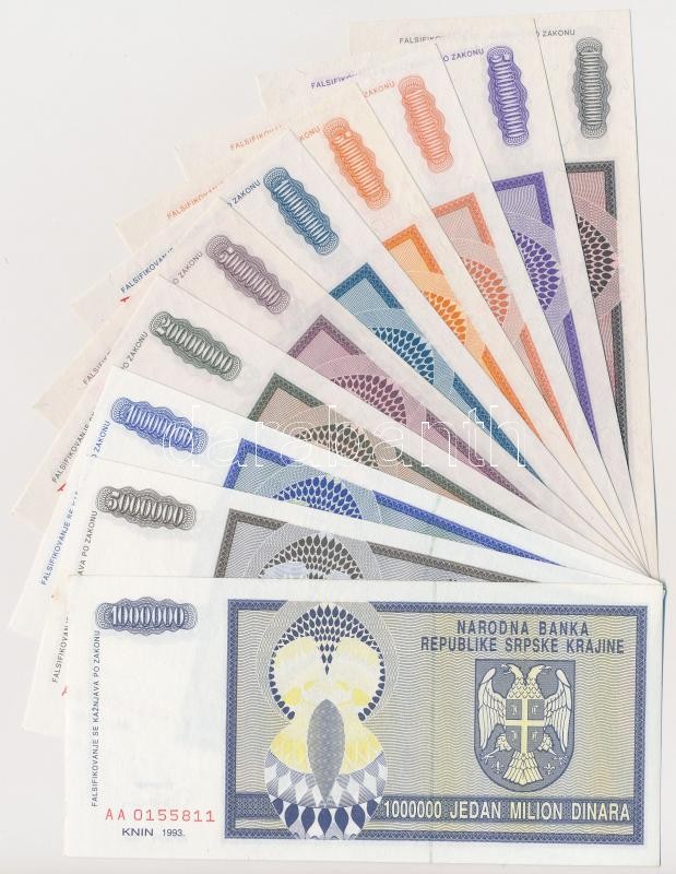 Croatia / Repbulic of Serbian Krajina 1993. 1.000.000 Dinara + 5.000.000 Dinara + 10.000.000 Dinara + 20.000.000 Dinara + 50.000.000 Dinara + 100.000.000 Dinara + 500.000.000 Dinara + 1.000.000.000 Dinara + 5.000.000.000 Dinara + 10.000.000.000 Dinara C:UNC