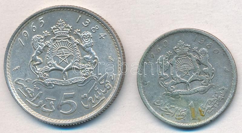 Marokkó 1960. 1D Ag "V. Mohammed" + 1965. 5D Ag "II. al... https://www.darabanth.com/de/336-Fernauktion/336.0/Numismatik/Weltweit-Munzen~1500013/Marokko-1960-1D-Ag-V-Mohammed-plus-1965-5D-Ag-II-al-Hassan-T2-3-Morocco-1960-1-Dirham-Ag-~II1886166