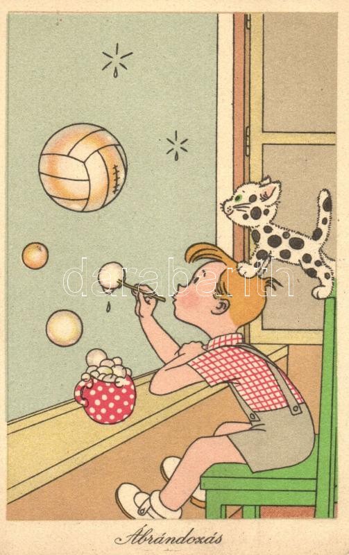 Beschreibung: Ábrándozás / Hungarian humorous graphic postcard, bored boy daydreaming (EK)