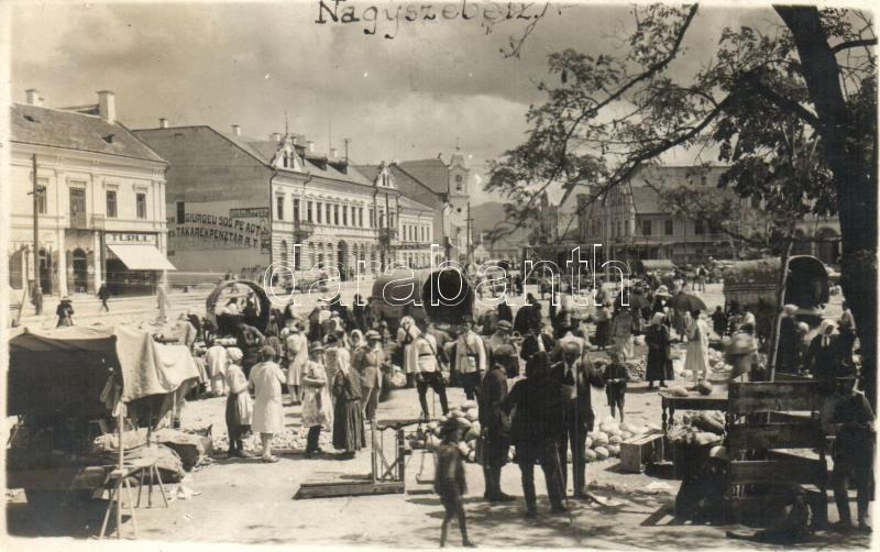 1931 Gyergyószentmiklós, Gheorgheni; piactér, piaci árusok és román katonák, Gyergyói Bank és Takarékpénztár, Turul cipő üzlet / marketplace, market vendors and Romanian soldiers, savings bank, shoe store, shops. Tilly Artz photo (Rb)