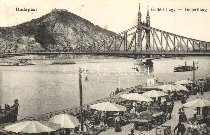Beschreibung: Budapest, Gellérthegy, Pesti rakparti piac árusokkal, Szabadság híd