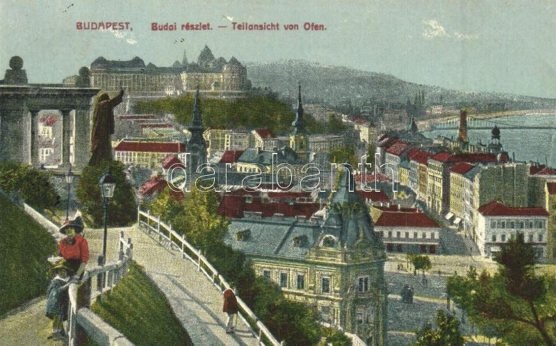 Beschreibung: Budapest I. Látkép a Gellérthegyről, Szent Gellért szobor, Döbrentei tér, Lánchíd, Királyi vár