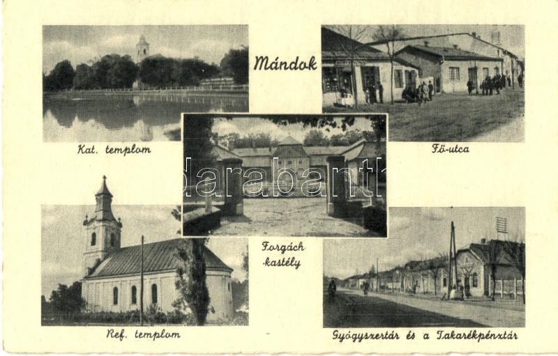 Beschreibung: Mándok, Katolikus és református templom, Forgách kastély, Fő utca, gyógyszertár, takarékpénztár (Rb)