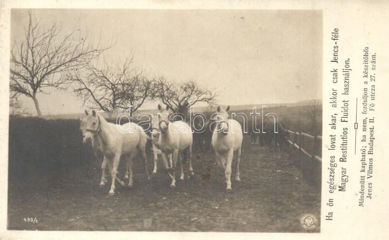 1908 Ha ön egészséges lovat akar, akkor csak Jencs-féle Magyar Restitutios Fluidot használjon. Jencs Vilmos Budapest II. Fő utca 27. ló orvosság reklámlap / Hungarian horse medicine advertisement