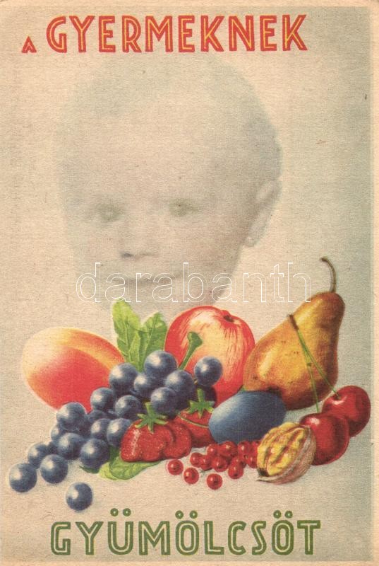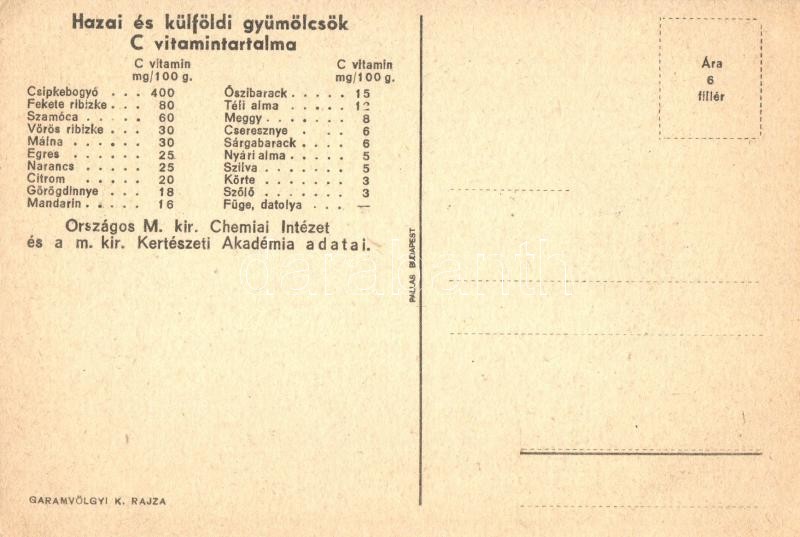 A gyermeknek gyümölcsöt! Magyar egészségügyi propaganda, C-vitamin táblázat a hátoldalon / Hungarian health campaign propaganda, Vitamin C chart s: Garamvölgyi K.