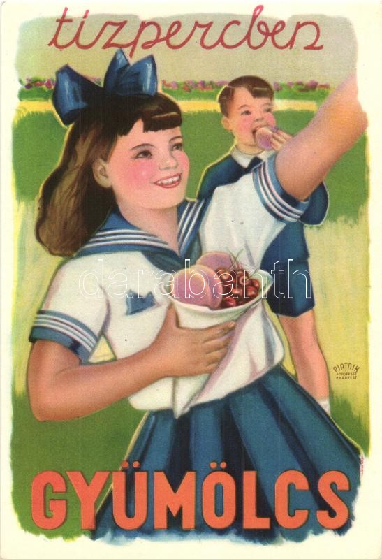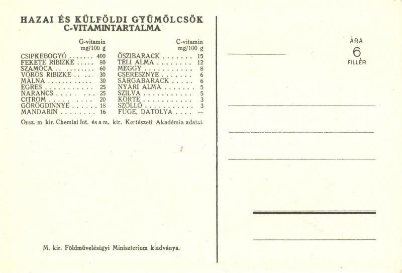 Tízpercben gyömölcs! Magyar egészségügyi propaganda, C-vitamin táblázat a hátoldalon. M. kir. Földművelésügyi Minisztérium kiadványa / Hungarian health campaign propaganda, Vitamin C chart