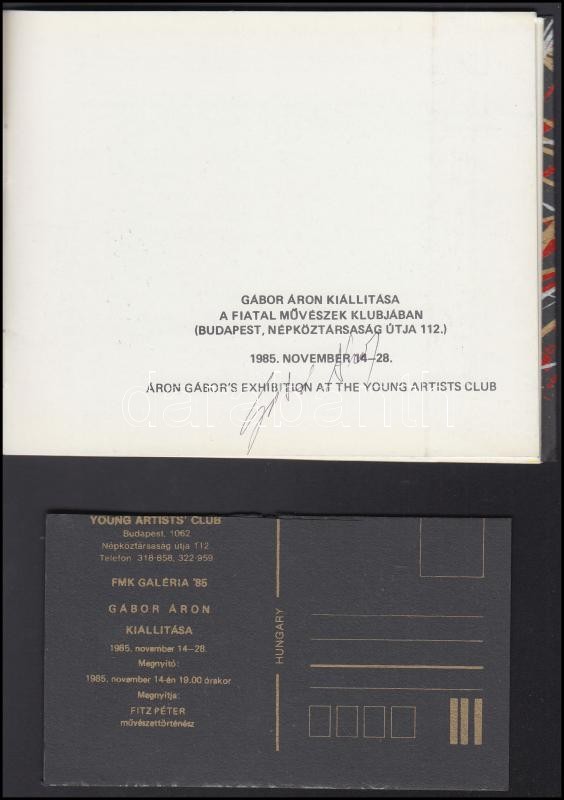 Gábor Áron kiállítása a Fiatal Művészek Klubjában. 1985. nov. 14-28. Magyar és angol nyelven. A kiállításhoz tartozó képeslappal. A művész által aláírt.