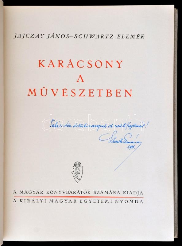 Jajczay János-Schwartz Elemér: Karácsony a művészetben. Bp., 1942, Kir. M. Egyetemi Nyomda, 255 p.+CXXVIII t. (Fekete-fehér képtáblák.) Szövegközti képekkel illusztrált. Kiadói aranyozott gerincű félvászon kötésben, kissé kopott, kissé foltos borítóval. Az egyik szerző, Schwartz Elemér (1890-1962) nyelvész, egyetemi tanár által dedikált.