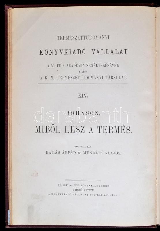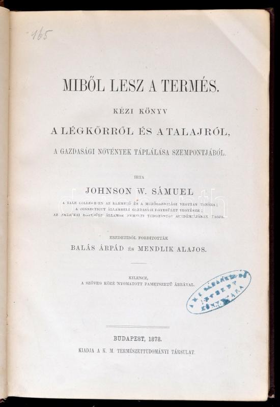 Johnson W. Sámuel: Miből lesz a termés? Kézi könyv a légkörről és a talajról, a gazdasági növények táplálása szempontjából. Fordította: Balás Árpád, Mendlik Alajos. Bp.,1878, K. M. Természettudományi Társulat, VIII+360 p. Szövegközti fametszetű ábrákkal illusztrált. Kiadói aranyozott egészvászon-kötés, kopott borítóval, volt könyvtári példány.