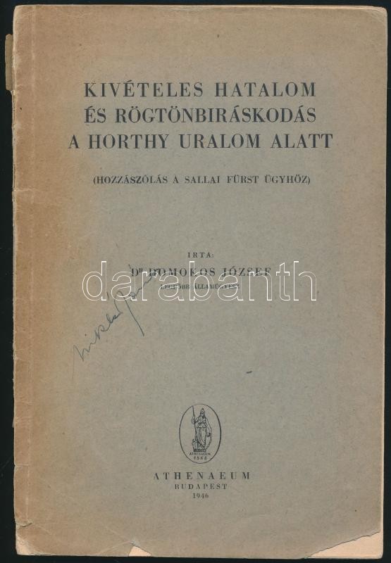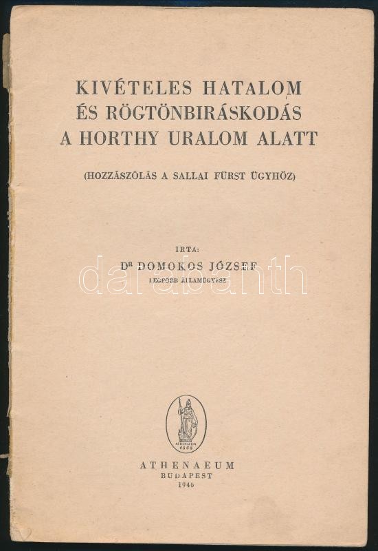 Dr. Domokos József: Kivételes hatalom és rögtönbíráskodás a Horthy uralom alatt. (Hozzászólás a Sallai Fürst ügyhöz.) Bp., 1946, Athenaeum, 63 p. Kiadói szakadt, sérült papírborítóban, az elülső borító elvált a gerincétől.