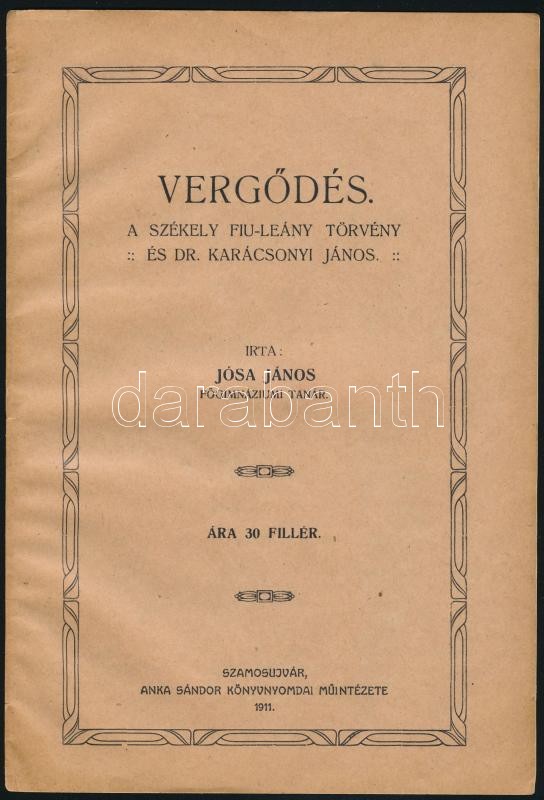 1911 Szamosújvár, Jósa János: Vergődés, a székely fiú-leány törvény és... https://www.darabanth.com/de/337-Fernauktion/337.0/Kunst-Dokumente-andere-Sammelgebiete/Drucksachen~500029/1911-Szamosujvar-Josa-Janos-Vergodes-a-szekely-fiu-leany-torveny-es-Dr-Karacsonyi-J~II1892507