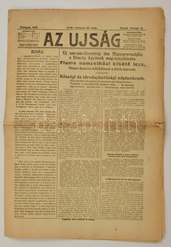 1919 Az Újság ferbruár 14. száma Fiume sorsáról való tudósítással https://www.darabanth.com/de/337-Fernauktion/337.0/Kunst-Dokumente-andere-Sammelgebiete/Drucksachen~500029/1919-Az-Ujsag-ferbruar-14-szama-Fiume-sorsarol-valo-tudositassal~II1894132