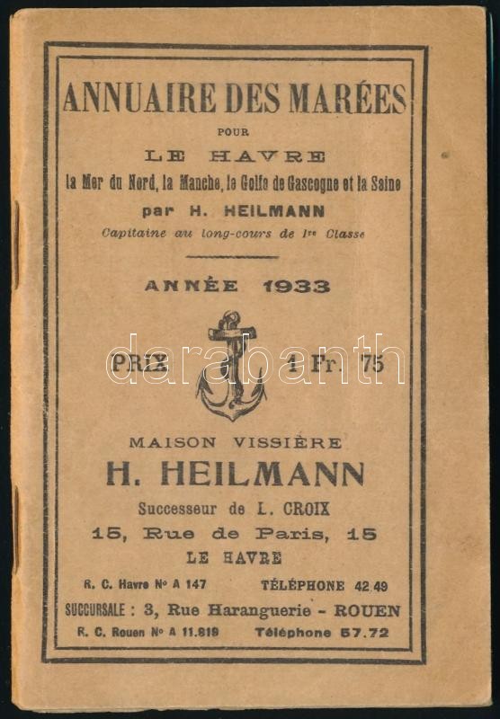 1933 H. Heilmann: Annuaire des Marées pour Le Havre la Mer du Nord, la Manche, la Golfe da Gascogne et la Saine. Anné 1933. Le Havre, Maison Vissére, 72 p.+ 1 t. (Kihajtható melléklet.) Francia nyelven. A kihajtható színes melléklet egyik oldalán zászlókkal, jelzésekkel, a másik oldalán két térképpel Le Havre kikötőjéről. Kiadói papírkötés, jó állapotban./ Paperbinding, in french language, in good condition.