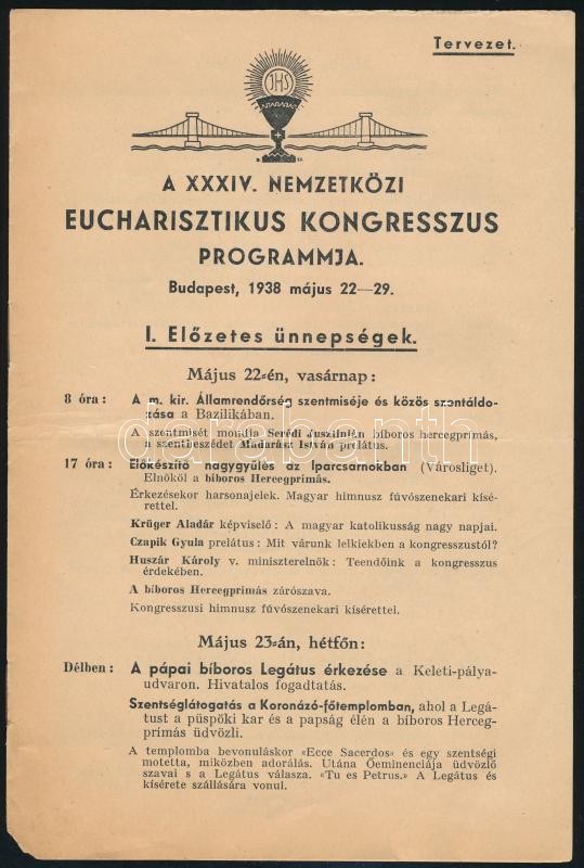 1938 A XXXIV. Nemzetközi Eucharisztikus Kongresszus programmja. Bp., 1... https://www.darabanth.com/de/337-Fernauktion/337.0/Kunst-Dokumente-andere-Sammelgebiete/Drucksachen~500029/1938-A-XXXIV-Nemzetkozi-Eucharisztikus-Kongresszus-programmja-Bp-1938-maj-22-29-Bp-Stepha~II1892189