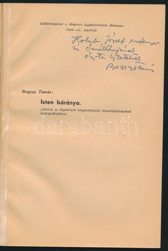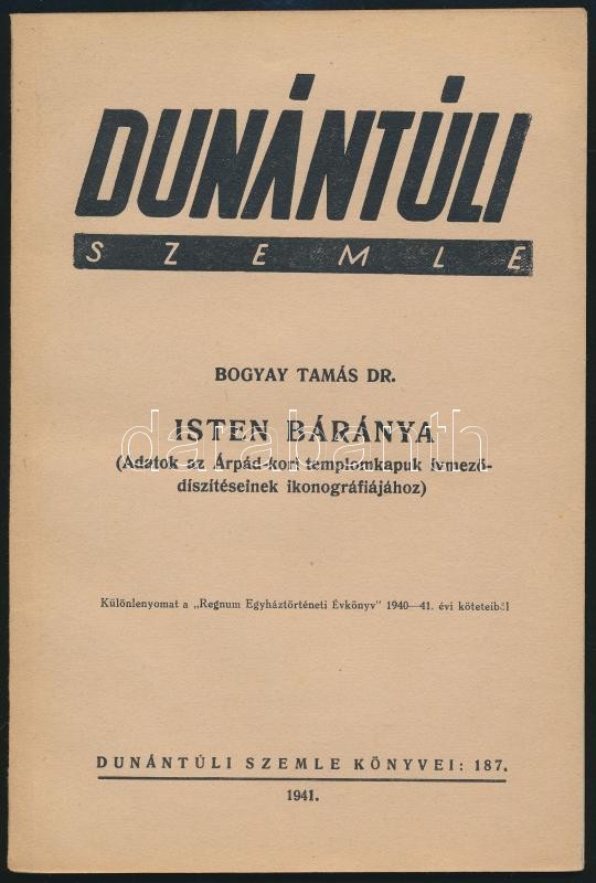 1941 Dr. Bogyay Tamás: Isten báránya. (Adatok az Árpád-kori templomkapuk ívmeződíszítéseinek ikonográfiájához.) Dunántúli Szemle könyvei. 187. Szombathely,1941, Martineum Könyvnyomda Rt., 2+95-122 p+3 t. Kiadói papírkötés.