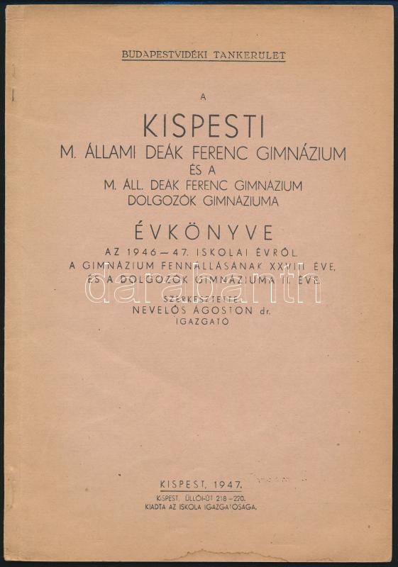 1947-1948 Bp., A Kispesti Deák Ferenc Gimnáziummal kapcsolatos tételek 4 db: 1947-1948 A Kispesti Deák Ferenc Gimnázium 2 db évkönyve 1946-1947, és 1947-1948. iskolai évéről. Kispest, 1947-1948, Kultur-nyomda-Fischhof Nyomda,28+35 p. Kiadói papírkötésben. + 1948 Meghívó a Kispesti Deák Ferenc Gimnázium érettségi báljára, az iskola borítékjában. + 1948 Miniszterelnök, Dinnyés Lajos, gépelt elutasító levele a bál fővédnöki posztjának elutasítása tárgyában.