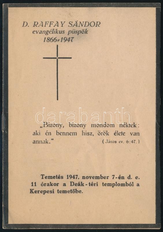 1974 Raffay Sándor (1866-1947) evangélikus püspök, író, költő, műfordító, teológus, akadémiai tanár, evangélikus teológiai akadémiai tanár, felsőházi tag temetési meghívója