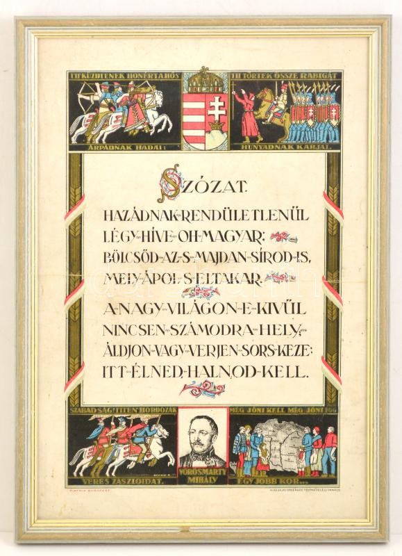Beschreibung: cca 1925 Szózat - hazafias emléklap címerrel és dekoratív illusztrációkkal, irredenta motívumokkal, középen hajtásnyom, üvegezett keretben, 43×29 cm