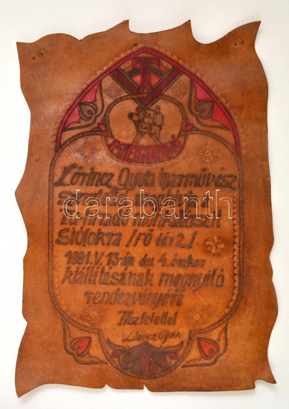 1981 Lőrincz Gyula iparművész kiállítására készített bőr meghívó kispl... https://www.darabanth.com/de/337-Fernauktion/337.0/Kunst-Dokumente-andere-Sammelgebiete/Flohmarkt~500011/1981-Lorincz-Gyula-iparmuvesz-kiallitasara-keszitett-bor-meghivo-kisplasztika-39x55-cm~II1874136