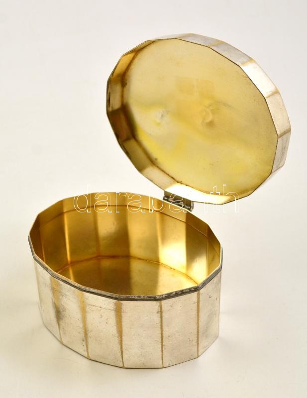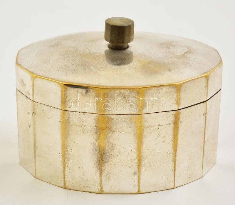 Beschreibung: Art-deco alpakka cukordoboz, belül aranyozott, jelzés nélkül, bakelit fogóval, 13×10 cm