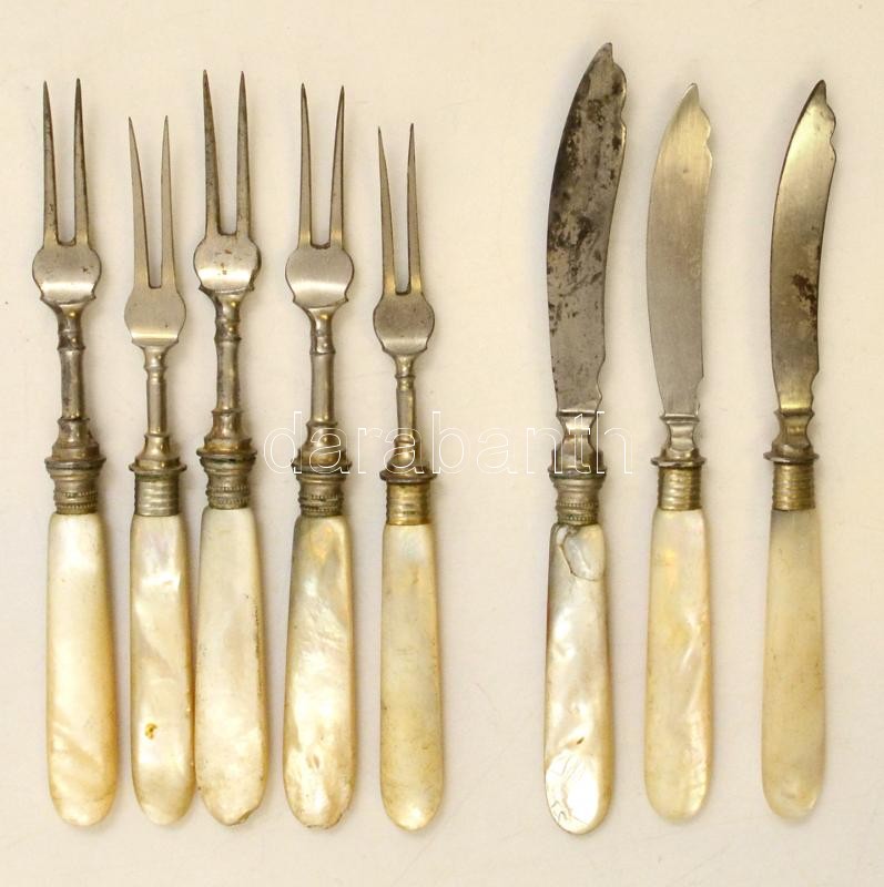 Gyöngyháznyelű kisméretű sajtvilla és kés, 8 db https://www.darabanth.com/de/337-Fernauktion/337.0/Kunst-Dokumente-andere-Sammelgebiete/Flohmarkt~500011/Gyongyhaznyelu-kismeretu-sajtvilla-es-kes-8-db~II1878170