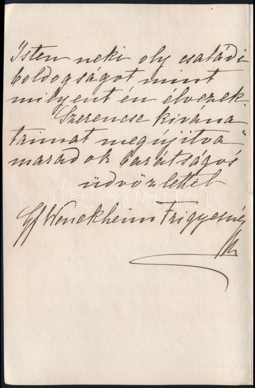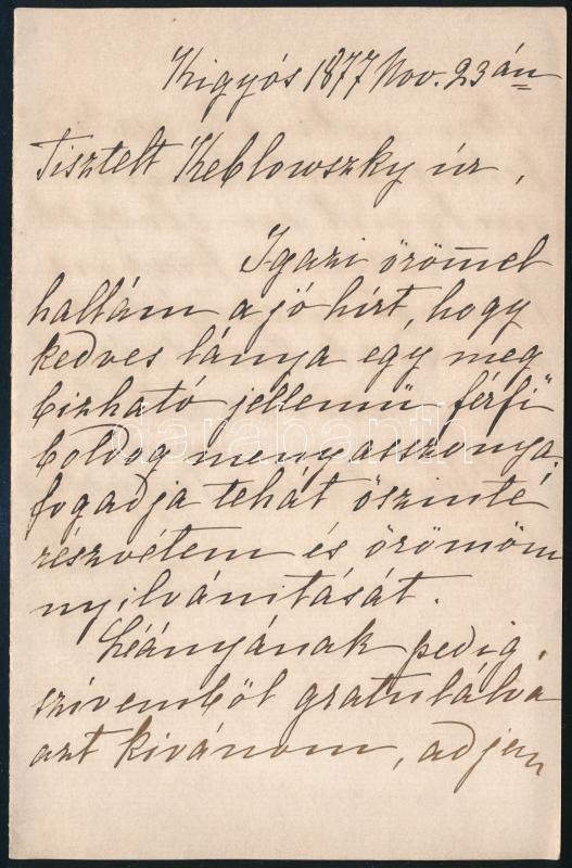 1877 (Szabad)kigyós Wenckheim Frigyesné Wenckheim Krisztina (1849-1924) saját kézzel írt levele Keblowszky (Lajos) a kigyósi uradalom ügyészének, melyben gratulál Keblowszky leányának eljegyzéséhez.