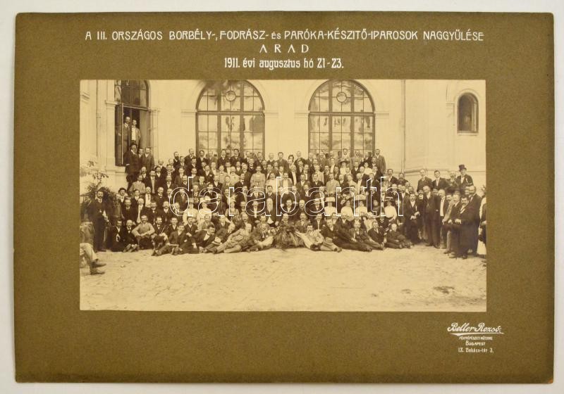 1911 Arad, A III. Országos Borbély-, Fodrász- és Parókakészítő Iparosok Nagygyűlése, kartonra kasírozott fotó, Beller Rezső műterméből, szép állapotban, 33×49,5 cm