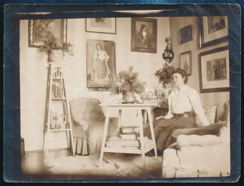 Beschreibung: cca 1905 Assakürti (Felvidék) Ghyczy Emma (1872-1928) otthonában, hátoldalon feliratozott fotó, felületén törésnyommal, 9×12 cm